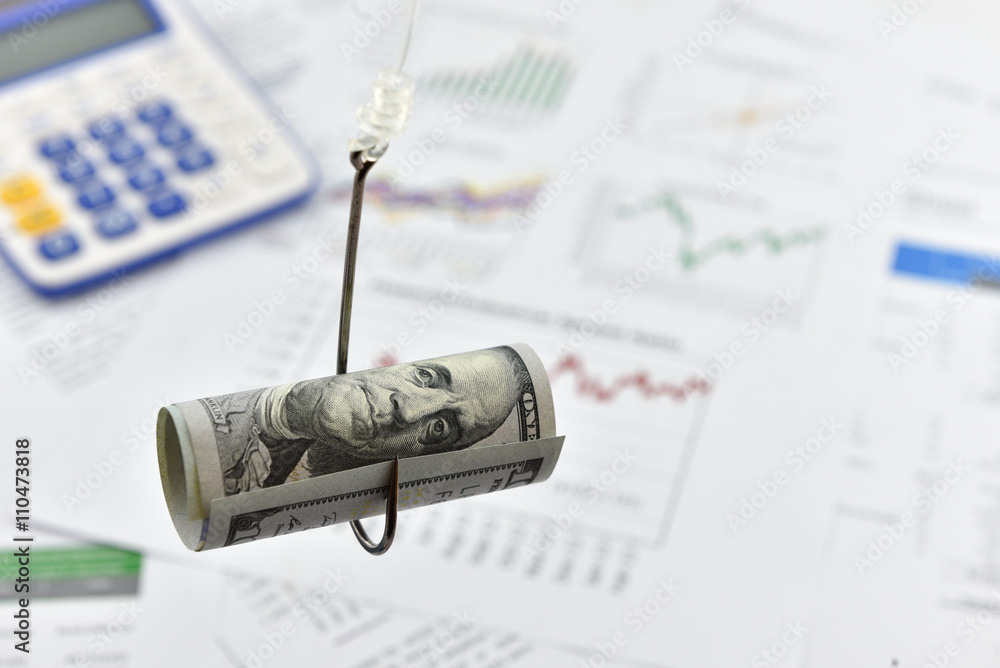 Rolled Up Scroll Of Us 100 Dollar Bill As A Lure Placed On A Fishing Hook